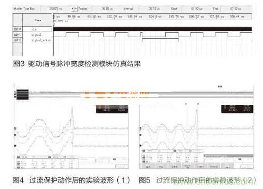 電路實現(xiàn):在CPLD中設置預先設定的計數(shù)門限值,即驅(qū)動信號高電平或者低電平持續(xù)的最大計數(shù)值;對輸入的驅(qū)動信號的高電平或者低電平持續(xù)計數(shù),將采樣得到的單位計數(shù)值與預置的門限計數(shù)值進行比較,如果計數(shù)值小于或者大于預先設置的值,則檢測模塊輸出閉鎖信號,切斷驅(qū)動信號輸出模塊的信號輸出,完成驅(qū)動信號的高電平脈沖寬度檢測;同時,模塊將驅(qū)動信號進行反相邏輯轉(zhuǎn)換,然后再檢測轉(zhuǎn)換后形成的高電平脈沖寬度,這樣,實現(xiàn)驅(qū)動信號的低電平的脈沖寬度檢測。
