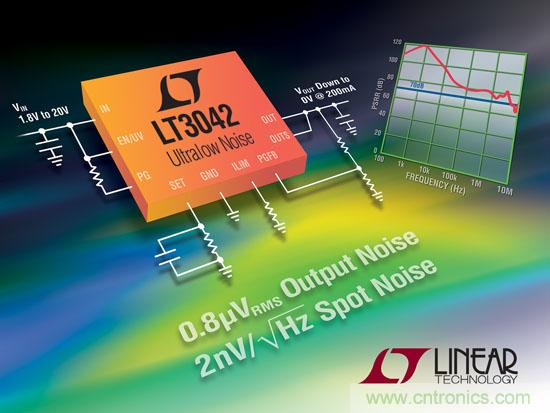 【導(dǎo)讀】近日,凌力爾特公司推出領(lǐng)先的具備超低噪聲、超高電源紋波抑制的低壓差電壓線性調(diào)節(jié)器 LT3042。該器件的優(yōu)勢在于具有僅為 2nV/√Hz (在 10kHz) 的超低點噪聲和 0.8µVRMS 的積分輸出噪聲 (在 10Hz 至 100kHz 的寬帶寬內(nèi))。該器件低頻和高頻 PSRR 性能使其占有巨大的優(yōu)勢。低頻 PSRR 超過 90dB (直到 10kHz),而高頻 PSRR 則超過 75dB (直到 3MHz),可使噪聲或高紋波輸入電源變得 “安靜”。