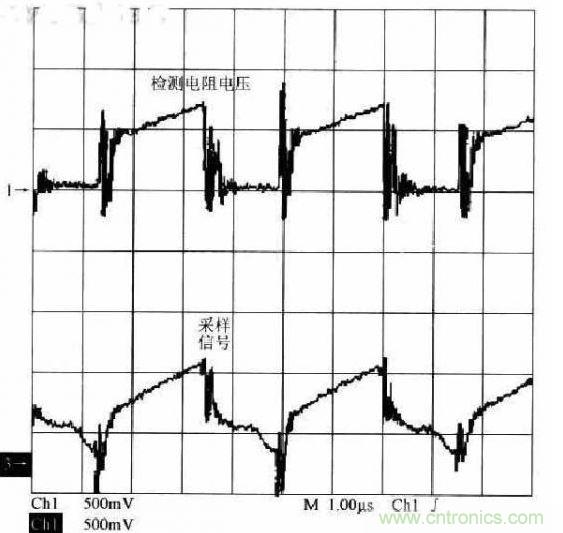 圖4給出了UC3842檢測(cè)電阻的電壓波形和采樣信號(hào)波形。從圖4中可以看出,經(jīng)過(guò)改進(jìn)后的電路,其采樣信號(hào)的波形緊緊跟隨檢測(cè)電阻的電壓波形,沒有出現(xiàn)非常大的尖峰電壓。因此,該電路能有效避免因變壓器漏感等異常干擾引起的電源誤操作的問(wèn)題,也能有效避免因電源占空比過(guò)大而引起的系統(tǒng)不穩(wěn)定的問(wèn)題。