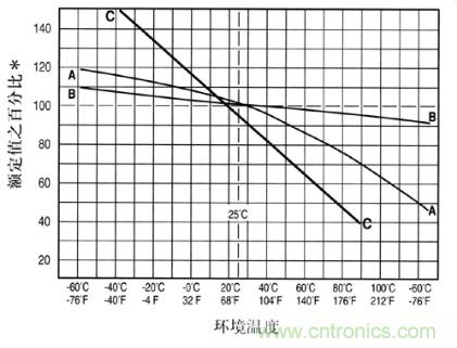 如圖所示為溫度降額曲線,以曲線A為例,在溫度為80℃時(shí),Tf為0.75。因此,若不考慮其他特性的影響,對3A的應(yīng)用,至少應(yīng)選擇4A(3/0.75=4)的保險(xiǎn)絲。