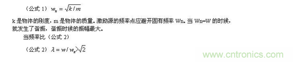 頻率可分為固有頻率Wn和激勵(lì)頻率W,固有頻率源于產(chǎn)品的結(jié)構(gòu)特征,由質(zhì)量、質(zhì)量分布、質(zhì)心位置、剛度等多個(gè)因素和多個(gè)因素間的相互作用所確定。固有頻率計(jì)算公式為(公式1)k是物體的剛度,m是物體的質(zhì)量。激勵(lì)源的頻率點(diǎn)應(yīng)避開固有頻率Wn。當(dāng)Wn=W的時(shí)候,就發(fā)生了諧振,諧振時(shí)候的振幅最大。