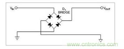 圖2是一個橋式整流器,不論什么極性都可以正常工作,但是有兩個二極管導通,功耗是圖1的兩倍。