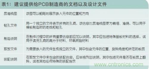 在設(shè)計(jì)嵌入元件時,為了確保成功無誤,重要的一點(diǎn)是與PCB制造商充分的溝通,表1中羅列出了建議提供給PCB制造商的文檔以及設(shè)計(jì)文件。
