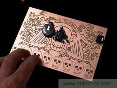 接著是跟前面的街頭涂鴉風(fēng)格完全不同的另一款迷你合成器電路板;電路板上并列的那一排骷髏是合成器的鍵盤(pán),振蕩器(oscillator)的間距是由皮膚接觸的電平來(lái)控制。事實(shí)上,玩這個(gè)小東西的秘訣是,在開(kāi)始彈奏之前先舔一舔(?!)指尖…