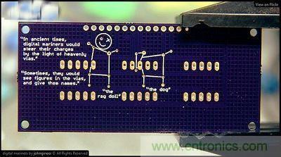 下面是一位自稱(chēng)“johngineer”的網(wǎng)友作品,這家伙的網(wǎng)站有不少很酷的東西(例如一只他自 己做的超酷龐克風(fēng)手表),還有非常專(zhuān)業(yè)的技術(shù)文章。“johngineer”沒(méi)有解釋這個(gè)電路板的作用,但他在上面印了兩段文字,想象未來(lái)如果有考古學(xué)家挖到這片電路板,會(huì)怎么解讀這種“文物”?