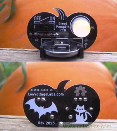 這是low voltage labs開(kāi)發(fā)的南瓜PCB,除了形狀很可愛(ài),還印了可愛(ài)的圖案;這款電路板上面有LED燈泡,就是讓你在萬(wàn)圣節(jié)放進(jìn)南瓜燈,不必?fù)?dān)心蠟燭會(huì)被風(fēng)吹熄….其實(shí)直接當(dāng)成擺飾也很有味道,而且只要6美元就買(mǎi)得到!