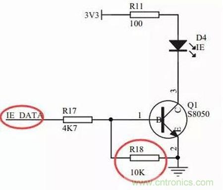 再這么解釋一下吧,如果IE_DATA那個地方,不連接任何引腳,那么由于R18的下拉作用,IE_DATA就是低電平,所以三極管就不會導通。
