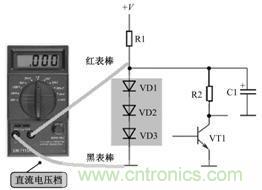 檢測(cè)這一電路中的3只二極管最為有效的方法是測(cè)量二極管上的直流電壓,如圖所示是測(cè)量時(shí)接線示意圖。如果測(cè)量直流電壓結(jié)果是1.8V左右,說(shuō)明3只二極管工作正常;如果測(cè)量直流電壓結(jié)果是0V,要測(cè)量直流工作電壓+V是否正常和電阻R1是否開(kāi)路,與3只二極管無(wú)關(guān),因?yàn)?只二極管同時(shí)擊穿的可能性較??;如果測(cè)量直流電壓結(jié)果大于1.8V,檢查3只二極管中有一只開(kāi)路故障。