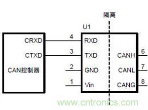 干擾不但影響信號(hào),更嚴(yán)重的會(huì)導(dǎo)致板子死機(jī)或者燒毀,所以接口和電源的隔離是抗干擾的第一條“軍規(guī)”.隔離的主要目的是:避免地回流燒毀電路板和限制干擾的幅度,保護(hù)控制器不死機(jī)。如圖3所示,為未隔離時(shí),兩個(gè)節(jié)點(diǎn)的地電位不一致,導(dǎo)致有回流電流,產(chǎn)生共模信號(hào),CAN的抗共模干擾能力是-12~7V,超過(guò)這個(gè)差值則出現(xiàn)錯(cuò)誤,如果共模差超過(guò)±36V,燒毀收發(fā)器或者電路板。