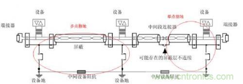 使用屏蔽線后,在屏蔽層沒有良好接大地前,屏蔽線是不起作用的。所以我們要選擇一種接地方式。通常來(lái)說(shuō),屏蔽層單點(diǎn)接地可以避免地回流(不同位置的地電位不同而導(dǎo)致的產(chǎn)生電流)、多點(diǎn)接地可以加快高頻干擾信號(hào)的泄放。所以要根據(jù)實(shí)際情況選擇合適的接地方式。如圖11所示。