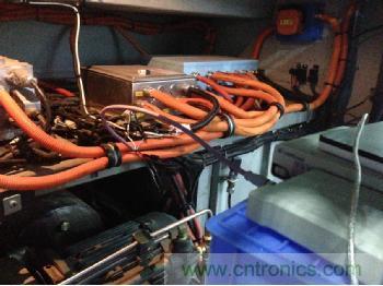 遠(yuǎn)離干擾源是最簡(jiǎn)單的抗干擾方法,如果CAN線與強(qiáng)電干擾源遠(yuǎn)離0.5米,干擾就基本影響不到了??墒窃趯?shí)際布線中,經(jīng)常遇到空間太小而不得不和強(qiáng)電混在一起,如圖12所示,為某新能源汽車的驅(qū)動(dòng)系統(tǒng),CAN線與驅(qū)動(dòng)線混在一起,結(jié)果導(dǎo)致干擾很大。只要與CAN并行的驅(qū)動(dòng)線,具備2A/秒的電流變化,就會(huì)耦合出強(qiáng)磁場(chǎng)而導(dǎo)致CAN線上出現(xiàn)干擾脈沖。所以CAN線必須要和電流會(huì)劇烈變化的線纜遠(yuǎn)離。比如繼電器、電磁閥、逆變器、電機(jī)驅(qū)動(dòng)線等。
