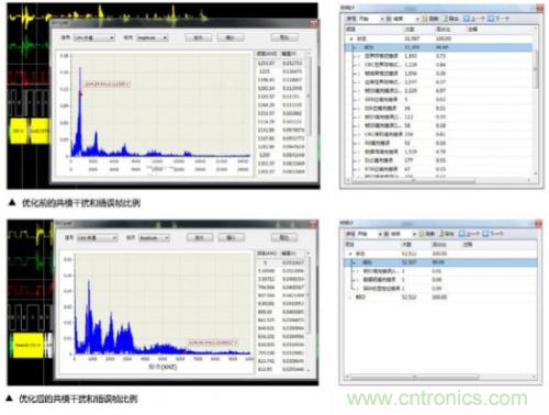 磁環(huán)的效果可以大大削減特定頻率的干擾強(qiáng)度,在增加磁環(huán)前,需要用CANScope或者示波器FFT快速傅里葉變化功能,測(cè)試出最高干擾的頻率,然后向磁環(huán)廠家定制對(duì)應(yīng)頻率的磁環(huán)。如圖14所示。為增加磁環(huán)前和增加磁環(huán)后的FFT的結(jié)果??梢钥闯龈蓴_強(qiáng)度明顯減小。