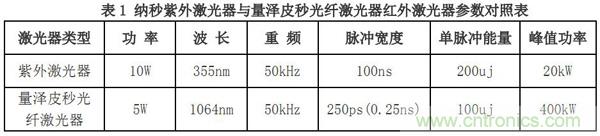 皮秒光纖激光器是在超快激光基礎(chǔ)上開發(fā)出的新一代激光器,尤其是近年來光纖器的研制成功,標(biāo)志著激光技術(shù)的一次飛躍進步,與固體納秒激光相比,皮秒光纖激光器具有以下優(yōu)點:1.激光脈沖寬度更窄,僅為 10^-12S,從上述材料吸收激光能量轉(zhuǎn)化為熱能的擴散距離公式可知,這將大大減小激光加工材料時的熱擴散距離,降低激光對材料的熱損傷;2.因脈沖寬度變窄,激光單脈沖峰值功率成倍增加,提升了激光加工材料的能力;3.光纖激光器以細(xì)小的光纖作為激光的傳輸和放大介質(zhì),與固體放大結(jié)構(gòu)相比,不僅工作穩(wěn)定,免除了周期性的調(diào)校工作,降低了維護成本,而且結(jié)構(gòu)小巧,制造成本相對較低。表1是量澤激光公司研制的光纖器與目前市面上主流的納秒級固體紫外激光器的參數(shù)對照: