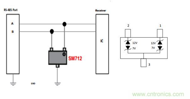對(duì)RS485接口的特點(diǎn)是收發(fā)電平的不對(duì)稱(chēng),為7V 和12V,所以需要專(zhuān)門(mén)設(shè)計(jì)不對(duì)稱(chēng)的保護(hù)芯片,而SM712 SOT-23封裝,專(zhuān)為保護(hù)具有非對(duì)稱(chēng)工作電壓(-7V至12V)的RS-485應(yīng)用而設(shè)計(jì),使其免受靜電放電(ESD)、電氣快速瞬變(EFT)和雷電引致的浪涌電流帶來(lái)的危害。 它能吸收高于IEC 61000-4-2國(guó)際標(biāo)準(zhǔn)規(guī)定之最高級(jí)別的反復(fù)性ESD放電 30KV,無(wú)需擔(dān)心其性能發(fā)生減退,并可在極低的箝位電壓下安全地耗散19A的8/20μs波形浪涌電流(IEC61000-4-5)。