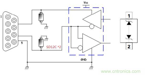 RS232接口一般為內(nèi)部配置接口,或短距離低速通信口,但此接口經(jīng)常插拔,需要采用功率300W以上產(chǎn)品進(jìn)行靜電和浪涌保護(hù),所以需采用SOD-323封裝的SD12C或SD15C(根據(jù)客戶芯片的工作電壓波動(dòng)不同)來(lái)保護(hù)收發(fā)2路信號(hào)。