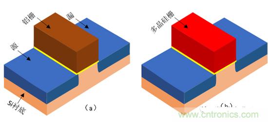 MOS誕生之初,柵極材料采用金屬導(dǎo)體材料鋁,因?yàn)殇X具有非常低的電阻,它不會(huì)與氧化物發(fā)生反應(yīng),并且它的穩(wěn)定性非常好。柵介質(zhì)材料采用SiO2,因?yàn)镾iO2可以與硅襯底形成非常理想的Si-SiO2界面。如圖1.13(a)所示,是最初鋁柵的MOS管結(jié)構(gòu)圖。