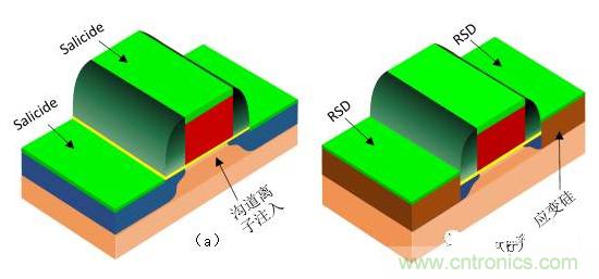 隨著MOS器件的特征尺寸不斷縮小到90nm及以下時(shí),短溝道效應(yīng)中的器件亞閾值電流成為妨礙工藝進(jìn)一步發(fā)展的主要因素,盡管提高溝道摻雜濃度可以在一定程度上抑制短溝道效應(yīng),然而高摻雜的溝道會(huì)增大庫(kù)倫散射,使載流子遷移率下降,導(dǎo)致器件的速度降低,所以僅僅依靠縮小MOS器件的幾何尺寸已經(jīng)不能滿足器件性能的提高,需要一些額外的工藝技術(shù)來(lái)提高器件的電學(xué)性能,例如應(yīng)變硅技術(shù)。應(yīng)變硅技術(shù)是通過外延生長(zhǎng)在源漏區(qū)嵌入應(yīng)變材料使溝道發(fā)生應(yīng)變,從而提高載流子遷移率,最終提高器件的速度。例如NMOS的應(yīng)變材料是SiC,PMOS的應(yīng)變材料是SiGe。另外,隨著源漏的結(jié)深的短減小,源漏擴(kuò)散區(qū)的厚度已經(jīng)不能滿足形成Salicide的最小厚度要求,必須利用新技術(shù)RSD(Raise Source and Drain)技術(shù)來(lái)增加源漏擴(kuò)散區(qū)的厚度。RSD技術(shù)是通過外延技術(shù)生長(zhǎng)在源漏區(qū)嵌入應(yīng)變材料的同時(shí)提高源漏擴(kuò)散區(qū)的厚度。如圖1.15(b)所示,是采用應(yīng)變硅和RSD技術(shù)的MOS管結(jié)構(gòu)圖。