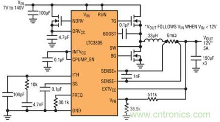 圖 1 所示原理圖在 7V 至 140V 輸入范圍內(nèi)產(chǎn)生 12V 輸出。當(dāng)輸入電壓低于 12V 時(shí),輸出電壓將跟隨輸入電壓,因?yàn)樵撈骷陧敹?MOSFET 連續(xù)接通時(shí),會(huì)以 100% 占空比運(yùn)行。由于 LTC3895 有內(nèi)置充電泵,所以可以實(shí)現(xiàn)這種功能。