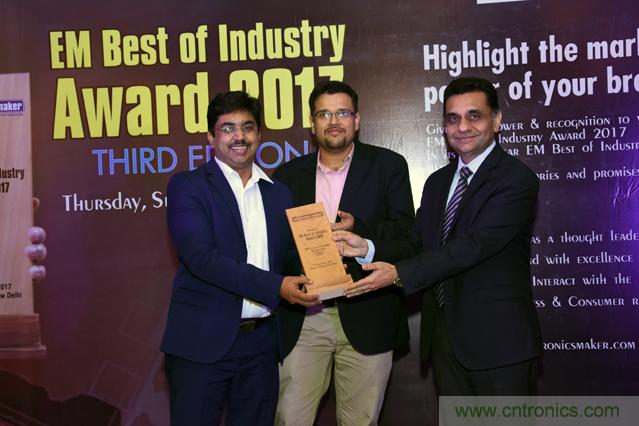 圖片說明:印度銷售經(jīng)理Bharat Kapoor(左)以及印度和南非現(xiàn)場應(yīng)用經(jīng)理Navneet Vinaik(中)接受EM行業(yè)最佳獎的“最佳電路保護組件獎”。