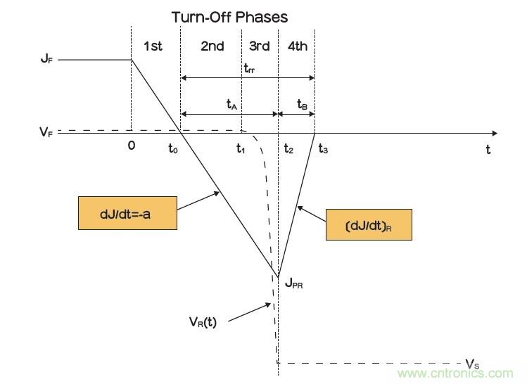 當(dāng)二極管正向偏壓變成反向偏壓時,電流不會立即降至零值,因?yàn)橄☉B(tài)期間儲存的電荷需要時間。因此,當(dāng)t=t0時,二極管開始換向操作,電流開始下降,下降斜率(-a)恒定,外部電感和電源電壓是決定斜率的唯一因素。在t1之前,二極管被施加正向偏壓,從t1到t2,二極管壓降上升,達(dá)到電源電壓;在t=t2時,反向電流達(dá)到最大值。間隔(t3-t0)被稱為反向恢復(fù)時間(trr),而負(fù)電流與零線之間的區(qū)域是反向恢復(fù)電荷(Qrr)。tB期間的電流斜率主要與產(chǎn)品設(shè)計和硅特性有關(guān)。