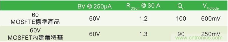 當(dāng)只有優(yōu)化Qrr和VF,diode才能提高系統(tǒng)總體性能時,集成肖特基二極管的新60V MOSFET是一個正確選擇。圖3列出了標(biāo)準(zhǔn)MOSFET和集成肖特基的功率開關(guān)的主要電參數(shù)(兩款產(chǎn)品的BVDSS和芯片尺寸相同)。