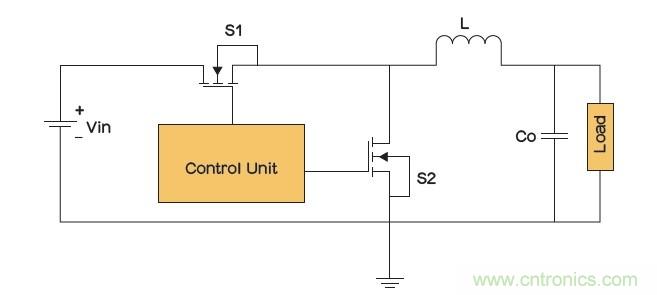 在一個同步降壓轉(zhuǎn)換器(圖4)內(nèi),集成肖特基二極管的功率MOSFET可以用作下橋臂開關(guān)(S2),以提高轉(zhuǎn)換器的總體性能。