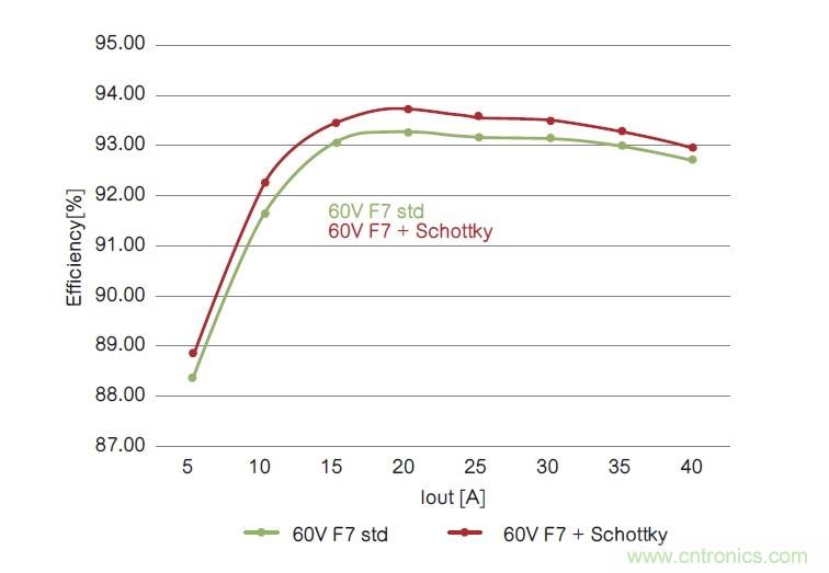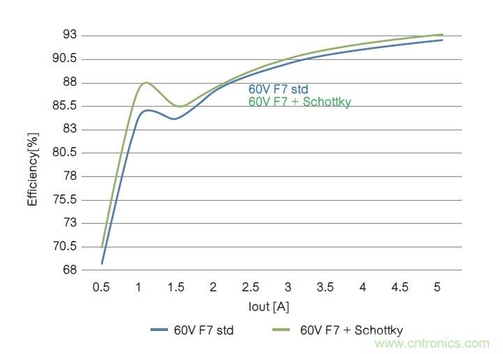 在兩個拓?fù)鋬?nèi),60V內(nèi)置肖特基二極管的器件在整個電流范圍內(nèi)性能表現(xiàn)更好,從而提高了系統(tǒng)總體性能。
