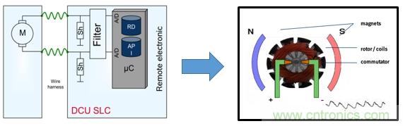電機(jī)有磁極、轉(zhuǎn)子線圈、換向器組成。根據(jù)右手定律轉(zhuǎn)子線圈通電后再磁極磁場的作用下產(chǎn)生運(yùn)動(dòng)。運(yùn)動(dòng)到磁場邊緣是磁場變?nèi)酰妱?dòng)勢減小,電流增大。換向器改變轉(zhuǎn)子線圈的電流方向,重新進(jìn)入磁場電動(dòng)勢增大,電流減小。轉(zhuǎn)子線圈不斷轉(zhuǎn)動(dòng)、電動(dòng)勢和電流不斷變化,從而紋波不斷產(chǎn)生。所以紋波是電機(jī)的固有特性,通過計(jì)算紋波的個(gè)數(shù)就能計(jì)算出轉(zhuǎn)子換向的次數(shù),就能計(jì)算出窗戶的相對位置,結(jié)合時(shí)間就能得出電機(jī)的轉(zhuǎn)速。