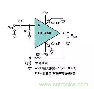 圖12.單電源同相輸入放大器電路正確的電源退耦方案。中頻增益=1+R2/R1