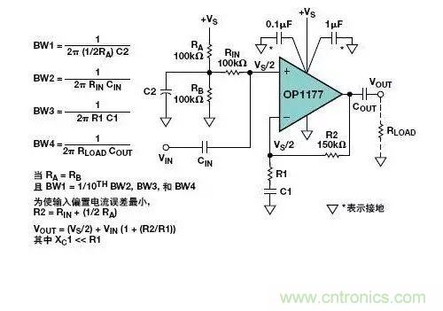 上面示出的CF試用值能夠提供大約0.03 Hz的–3 dB極點頻率。接在R3兩端的小電容器(0.01 μF)可使電阻器噪聲最小。