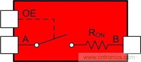 通過輸出使能引腳 (OE),用電壓來控制這個開關(guān);只需在高電平關(guān)閉開關(guān),在低電平時打開開關(guān)。(對于低電平有效OE引腳來說,恰恰相反;這些引腳上通常會有標(biāo)簽進(jìn)行標(biāo)注。)RON 是開關(guān)的內(nèi)部電阻。A和B到開關(guān)的兩個連接點。