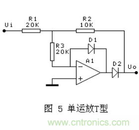 圖5 和 圖6 要求R1=2R2=2R3,增益為1/2,缺點是:當(dāng)輸入信號正半周時,輸出阻抗比較高,可以在輸出增加增益為2的同相放大器隔離.另外一個缺點是正半周和負(fù)半周的輸入阻抗不相等,要求輸入信號的內(nèi)阻忽略不計。