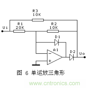 圖7正半周,D2通,增益=1+(R2+R3)/R1;負(fù)半周增益=-R3/R2;要求正負(fù)半周增益的絕對值相等,例如增益取2,可以選R1=30K,R2=10K,R3=20K