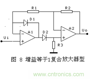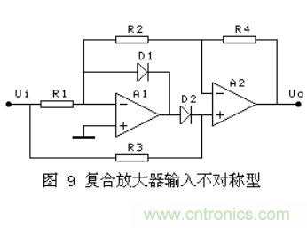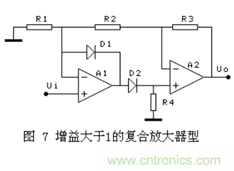 圖7,8,9三種電路,當(dāng)運放A1輸出為正時,A1的負(fù)反饋是通過二極管D2和運放A2構(gòu)成的復(fù)合放大器構(gòu)成的,由于兩個運放的復(fù)合(乘積)作用,可能環(huán)路的增益太高,容易產(chǎn)生振蕩。