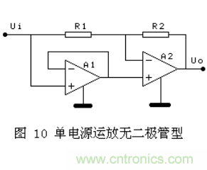 圖9要求R1=R2,R4可以用來調(diào)節(jié)增益,增益等于1+R4/R2;如果R4=0,增益等于1;缺點是正負(fù)半波的輸入阻抗不相等,要求輸入信號的內(nèi)阻要小,否則輸出波形不對稱。