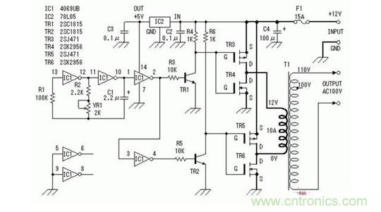 該逆變器使用功率場(chǎng)效應(yīng)晶體管作為逆變器裝置。用汽車電池供電。因此,在輸入電壓為12伏直流電。輸出電壓是100V的交流電。但是,輸入和輸出電壓不僅限于此。您可以使用任何電壓。他們依賴于變壓器使用。波形輸出為方波。根據(jù)經(jīng)驗(yàn),這個(gè)電路約100W功率 。