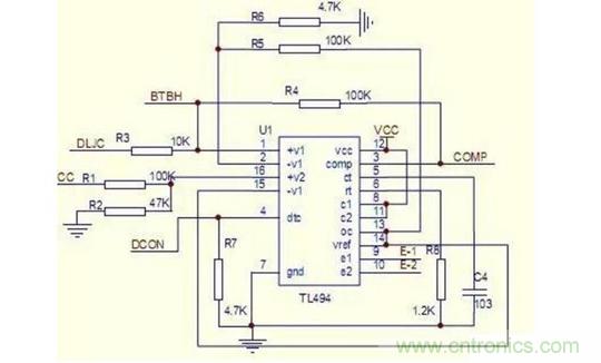 (1)腳第一組放大器的同相輸入端,檢測(cè)輸出電流,與3個(gè)0.33R 電阻分壓,當(dāng)電流過(guò)大時(shí),分壓電阻上的電壓超過(guò)(2)腳基準(zhǔn)電壓,(3)腳放大器輸出端輸出高電平,(3)腳為高電平時(shí),電路進(jìn)入保護(hù)狀態(tài)。(2)腳為比較器的反相輸入端,接(14)腳基準(zhǔn),作比較器的參考電壓,外部輸入端的控制信號(hào)可輸入至腳(4)的截止時(shí)間控制端(也叫死區(qū)時(shí)間控制),與腳(1)、(2)、(15)、(16)誤差放大器的輸入端,其輸入端點(diǎn)的抵補(bǔ)電壓為120mV,其可限制輸出截止時(shí)間至最小值,大約為最初鋸齒波周期時(shí)間的4%。當(dāng)13腳的輸出??刂贫私拥貢r(shí),可獲得96%最大工作周期,而當(dāng)(13)腳接制參考電壓時(shí),可獲得48%最大工作周期。如果我們?cè)诘?腳截止時(shí)間控制輸入端設(shè)定一個(gè)固定電壓,其范圍由0V至3.3V之間,則附加的截止時(shí)間一定出現(xiàn)在輸出上。 (5)、(6)腳是一個(gè)固定頻率的脈沖寬度調(diào)制電路,內(nèi)置了線性鋸齒波振蕩器,振蕩頻率可通過(guò)外部的一個(gè)電阻和一個(gè)電容進(jìn)行調(diào)節(jié),其振蕩頻率如下: