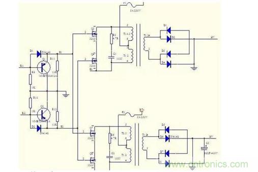 這是一個(gè)推挽式拓?fù)淠孀冸娐?,?dāng)E1驅(qū)動(dòng)脈沖驅(qū)動(dòng)時(shí),Q1導(dǎo)通,使VT3、VT6導(dǎo)通,VT7、VT8截止,此時(shí)電路進(jìn)行正半周波形放大,變壓器升壓到次級(jí),通過(guò)高頻整流管整流,當(dāng)E2脈沖驅(qū)動(dòng)時(shí),Q2導(dǎo)通,驅(qū)動(dòng)VT7、VT8導(dǎo)通。VT3、VT6截止,進(jìn)得負(fù)半周波形放大。經(jīng)升壓變壓器升壓后,高頻整流。