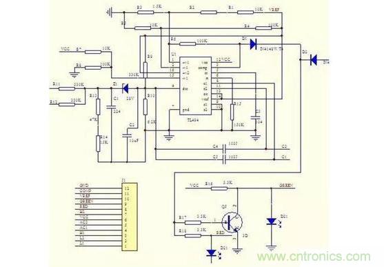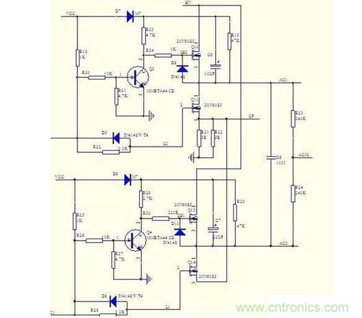 最后由TL494CN芯片的5腳外接點(diǎn)容C3和6腳外接電阻R15決定脈寬頻率為F=1.1÷(0.1×220)KHZ=50HZ控制Q10、Q11、Q13、Q14工作在50HZ的頻率下,將220V直流電逆變?yōu)?20V/50HZ的交流電,上圖將完成這部分功能。