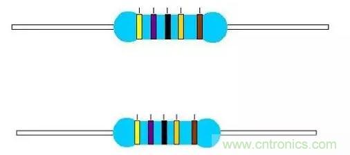 技巧2:棕色環(huán)是否是誤差標(biāo)志的判別。棕色環(huán)既常用做誤差環(huán),又常作為有效數(shù)字環(huán)。常常在第一環(huán)和最末一環(huán)中同時(shí)出現(xiàn),使人很難識(shí)別誰是第一環(huán)。在實(shí)踐中可以 按照色環(huán)之間的間隔加以判別。比如對(duì)于一個(gè)五道色環(huán)的電阻而言,第五環(huán)和第四環(huán)之間的間隔比第一環(huán)和第二環(huán)之間的間隔要寬一些,據(jù)此可判定色環(huán)的排列順序。