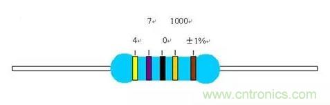 所以,黃色在第一環(huán)就是4,第二環(huán)紫色為7,第三環(huán)黑色是0,第四環(huán)就是乘積了10的3次方也就是1000,第五環(huán)是誤差了棕色為±1%?,F(xiàn)在我們來計(jì)算阻值:470*1000=470K,然后誤差是±1%,所以阻值的范圍是在465.3K—— 474.7K之間,其阻值都是正常的。