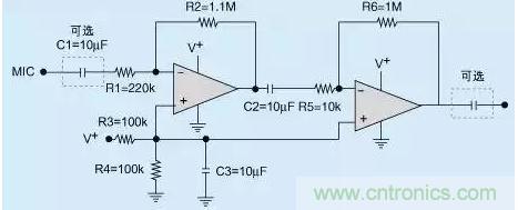請注意,這款電路只適用于單電源供電的設(shè)計(jì),其中輸入及輸出電容器(C1及C4)只是選項(xiàng),工程師可根據(jù)實(shí)際情況考慮選用。適用與否取決于用戶系統(tǒng)的輸入與輸出如何連接。若麥克風(fēng)輸出設(shè)有直流補(bǔ)償,那么便需要增設(shè)C1輸入電容器,以便阻塞直流電信號。輸出電容器也可發(fā)揮相同的作用。