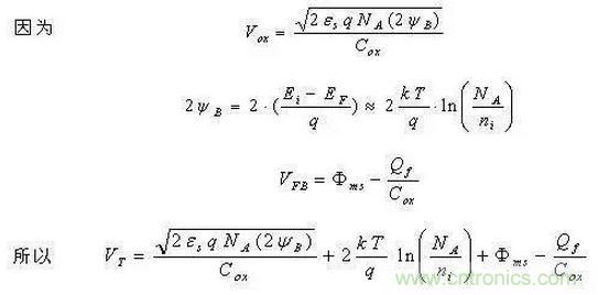 在閾值電壓的表示式中,與摻雜濃度和溫度有關(guān)的因素主要是半導(dǎo)體Fermi勢(shì)ψB。當(dāng)p型半導(dǎo)體襯底的摻雜濃度NA提高時(shí),半導(dǎo)體Fermi能級(jí)趨向于價(jià)帶頂變化,則半導(dǎo)體Fermi勢(shì)ψB增大,從而就使得更加難以達(dá)到ψs≥2ψB的反型層產(chǎn)生條件,所以閾值電壓增大。