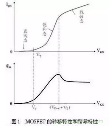 在VGS>VT時(shí),出現(xiàn)溝道,但如果源-漏電壓VDS=0,則不會(huì)產(chǎn)生電流;只有在VGS>VT和VDS>0時(shí),才會(huì)產(chǎn)生電流,這時(shí)必然有VDS >(VGS-VT),因此MOSFET處于溝道夾斷的飽和狀態(tài),于是源-漏電流隨柵-源電壓而平方地上升。相應(yīng)地,飽和跨導(dǎo)隨柵-源電壓而線性地增大,這是由于飽和跨導(dǎo)與飽和電壓(VGS-VT)成正比的緣故。