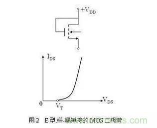 【答】這種集成MOS二極管的連接方式及其伏安特性如圖2所示。因?yàn)闁艠O與漏極短接,則VGS=VDS。因此,當(dāng)電壓較?。╒GS=VDS<VT)時(shí),不會(huì)出現(xiàn)溝道,則器件處于截止?fàn)顟B(tài),輸出電流IDS=0;當(dāng)電壓高于閾值電壓(VGS=VDS≥VT)時(shí),因?yàn)榭倽M足VDS>(VGS-VT)關(guān)系,于是出現(xiàn)了溝道、但總是被夾斷的,所以器件處于飽和狀態(tài),輸出源-漏電流最大、并且飽和,為恒流源。