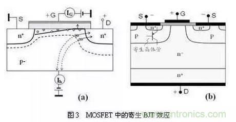 ③對(duì)于VDMOSFET:觀察圖3(b)中的結(jié)構(gòu),即可見(jiàn)到,當(dāng)器件正向?qū)〞r(shí),其中存在一個(gè)工作于放大狀態(tài)的寄生n-p-n晶體管(n+源區(qū)是發(fā)射區(qū),n-外延層是集電區(qū),p溝道是基區(qū))。該寄生晶體管的可能導(dǎo)電通道是與MOSFET的ID相并聯(lián)的,故在VDMOSFET工作時(shí),必須要注意防止寄生晶體管導(dǎo)通;否則,寄生晶體管的導(dǎo)通就可能引起二次擊穿,使得功率MOSFET完全失去功能。