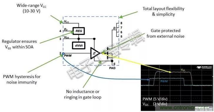 寬范圍Vcc;調(diào)節(jié)器可保護(hù)SOA內(nèi)的VGS;滯后的PWM可抗噪聲干擾;整體布局靈活簡潔;柵極可防止外部噪聲。