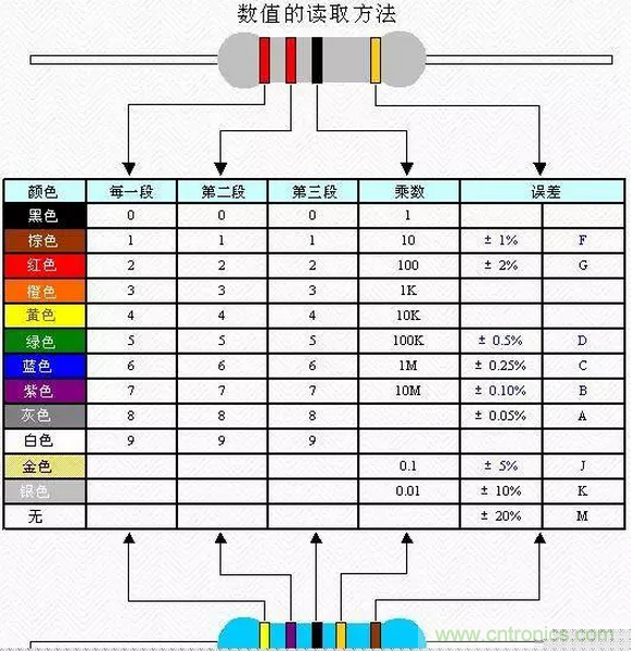 4、色標法:用不同顏色的帶或點在電阻器表面標出標稱阻值和允許偏差。國外電阻大部分采用色標法。