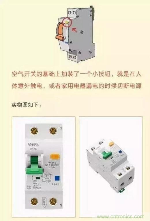 漏電斷路器是在空氣開關(guān)的基礎(chǔ)上添加的一個小按鈕,當(dāng)發(fā)生意外漏電的時候,會引發(fā)開關(guān)自動切斷電源。