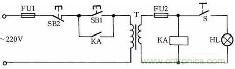 工作原理:閉合S后,按下按鈕SB1,變壓器得電輸出36V低電壓,使得繼電器或交流接觸器KA吸合。放松按鈕SB1后,KA自鎖觸點(diǎn)使KA保持吸合,繼續(xù)給變壓器接通電源。如果變壓器次級(jí)發(fā)生短路故障,繼電器線圈電壓為零,此時(shí)KA便失電釋放,將變壓器電源斷開(kāi),保護(hù)變壓器不被破壞。